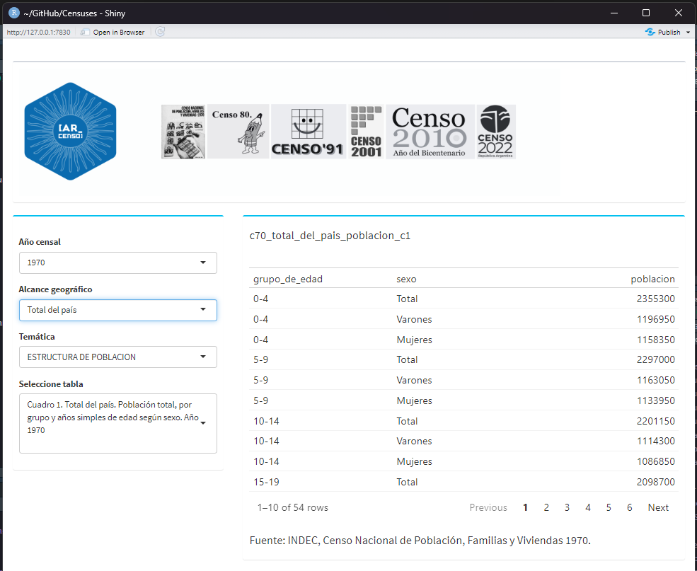 Develop an R data package that makes available the official national population census data of Argentina, produced by the National Institute of Statistics and Censuses (INDEC), covering the period from 1970 to 2022. The data are homogenized, organized, and ready to use. The package provides open access to these datasets, facilitating their use by the public, researchers, and decision-makers.